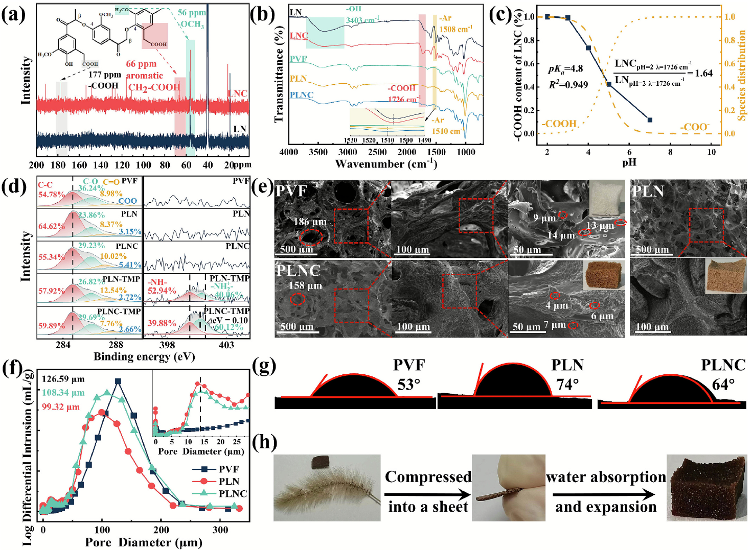甲氧苄啶(TMP)作为一种广泛使用的磺胺类抗生素,在水体中残留会诱导细菌产生耐药性,威胁生态环境与人类健康。现有吸附剂多为微纳米颗粒,存在易流失、回收难等问题,而三维多孔吸附剂(如沸石、树脂)存在机械强度不足等问题限制了实际应用。研究团队创新性地将羧甲基化木质素引入聚乙烯醇缩甲醛海绵(PVF),通过醚化反应制备出羧甲基木质素海绵(PLNC)。该材料不仅保留了PVF的高机械强度和多孔结构(孔径约10 μm),还引入了丰富的羧基官能团,显著提升了对TMP的吸附亲和力。